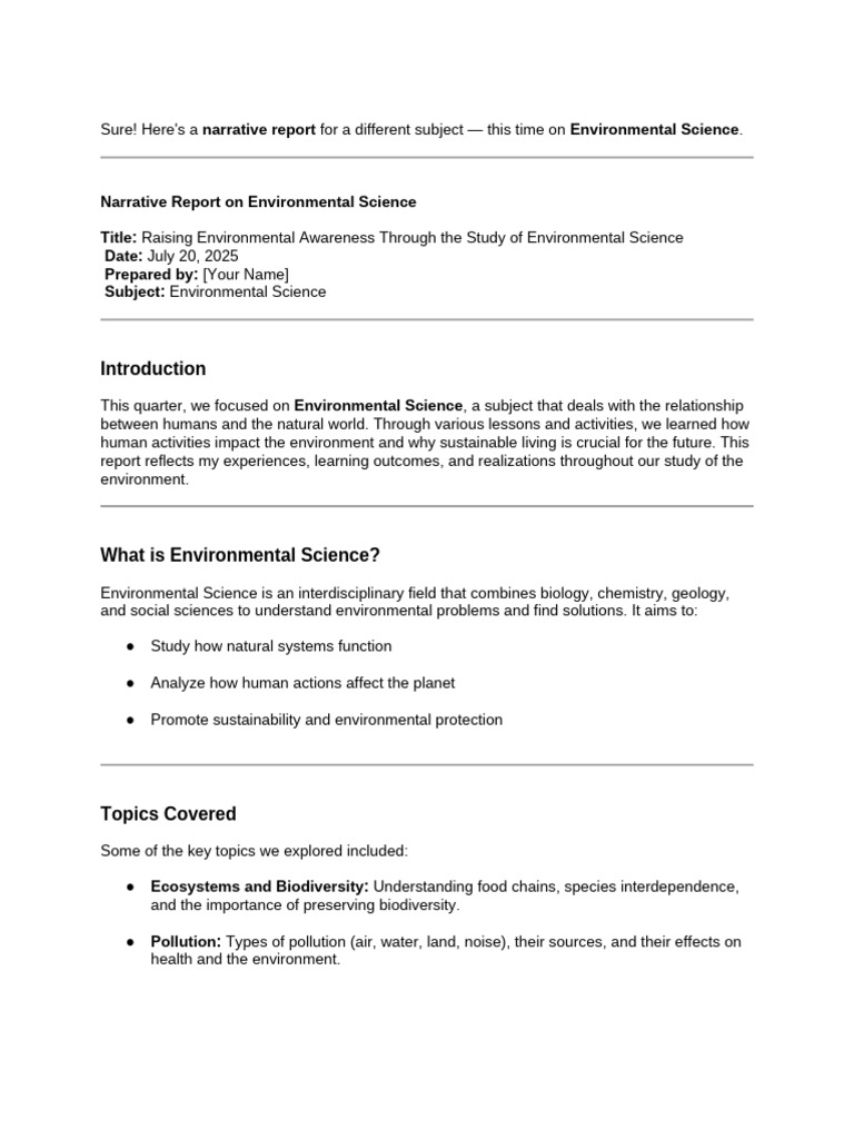 Sure! Here's a narrative report for a different subject — this time on Environmental Science.