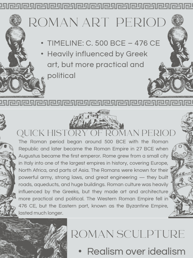 roads, aqueducts, and huge buildings. Roman culture was heavily