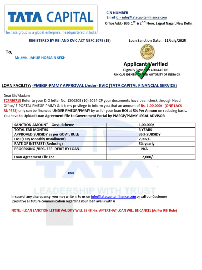 (Thank you for choosing Tata Capital Finance Under KVIC. and assuring you of our best Services at all time, looking