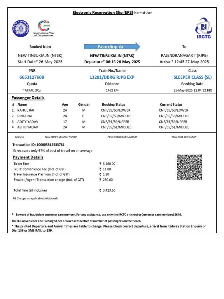 TATKAL (TQ) 1462 KM 25-May-2025 11:04:32 HRS