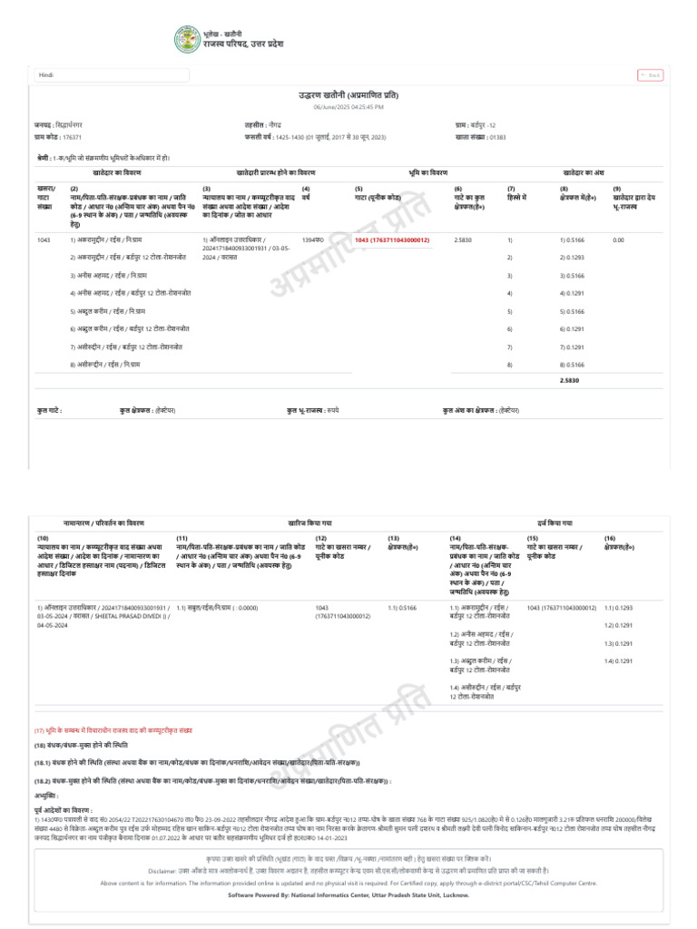 उद्धरण खतौनी (अप्रमाणित प्रति)