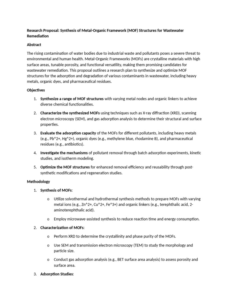 Research Proposal: Synthesis of Metal-Organic Framework (MOF) Structures for Wastewater