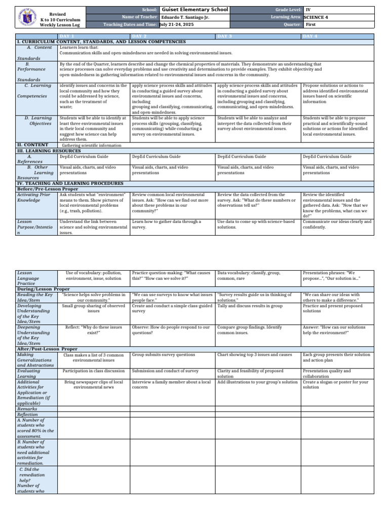 Name of Teacher Eduardo T. Santiago Jr. Learning Area: SCIENCE 4