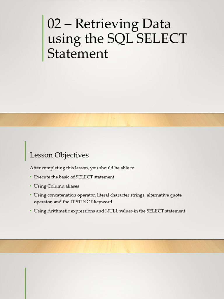 • Using Arithmetic expressions and NULL values in the SELECT statement