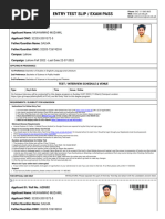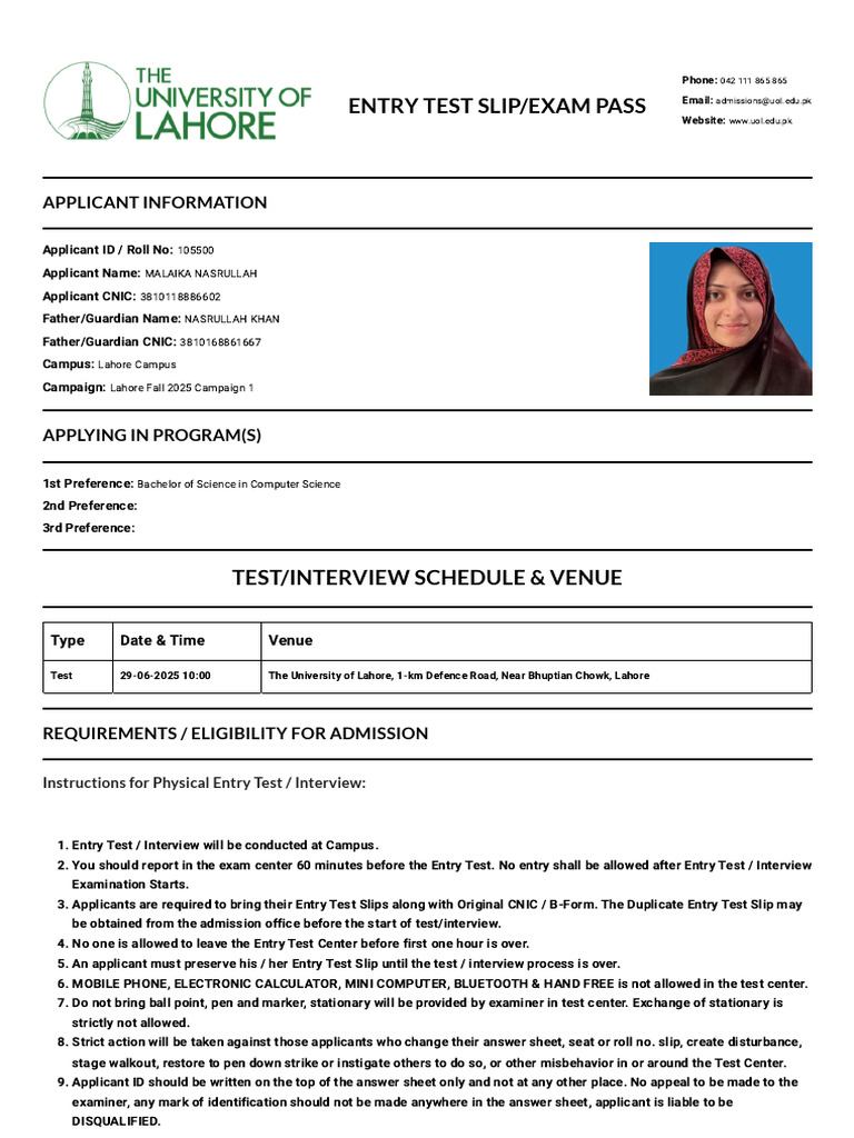 ENTRY TEST SLIP/EXAM PASS Email: admissions@uol.edu.pk