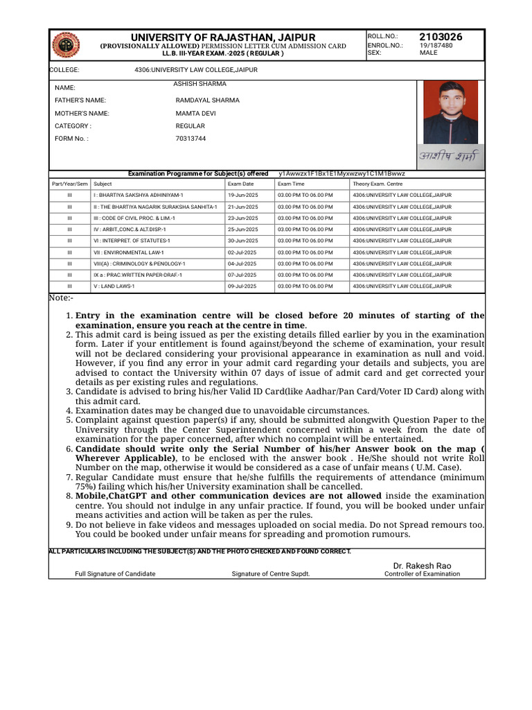 LL.B. III-YEAR EXAM.-2025 ( REGULAR ) SEX: MALE