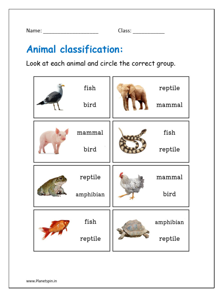 The document appears to be a worksheet for students to classify animals into their correct groups. It includes spaces for the student's name and class. The source of the document is from the website Planetspin.in.