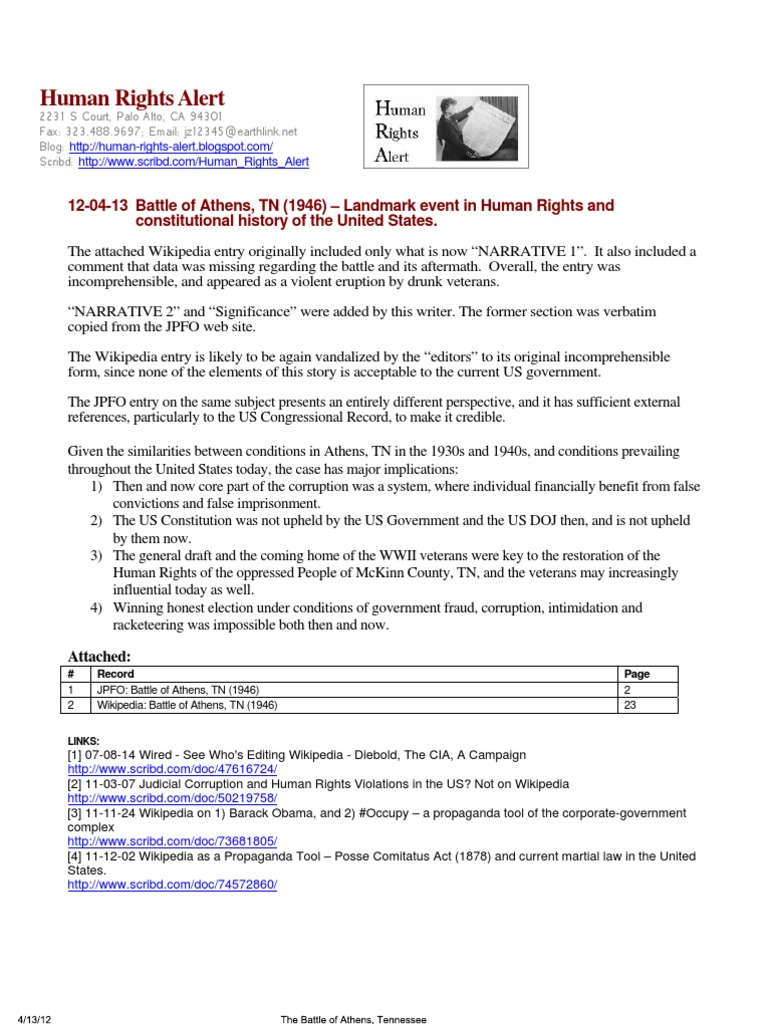 The JPFO entry on the same subject presents an entirely different perspective, and it has sufficient external references, particularly to the US Congressional Record, to make it credible. Given the similarities between conditions in Athens, TN in the 1930s and 1940s, and conditions prevailing throughout the United States today, the case has major implications: 1) Then and now core part of the corruption was a system, where individual financially benefit from false convictions and false imprisonment. 2) The US Constitution was not upheld by the US Government and the US DOJ then, and is not upheld by them now. 3) The general draft and the coming home of the WWII veterans were key to the restoration of the Human Rights of the oppressed People of McKinn County, TN, and the veterans may increasingly influential today as well. 4) Winning honest election under conditions of government fraud, corruption, intimidation and racketeering was impossible both then and now.