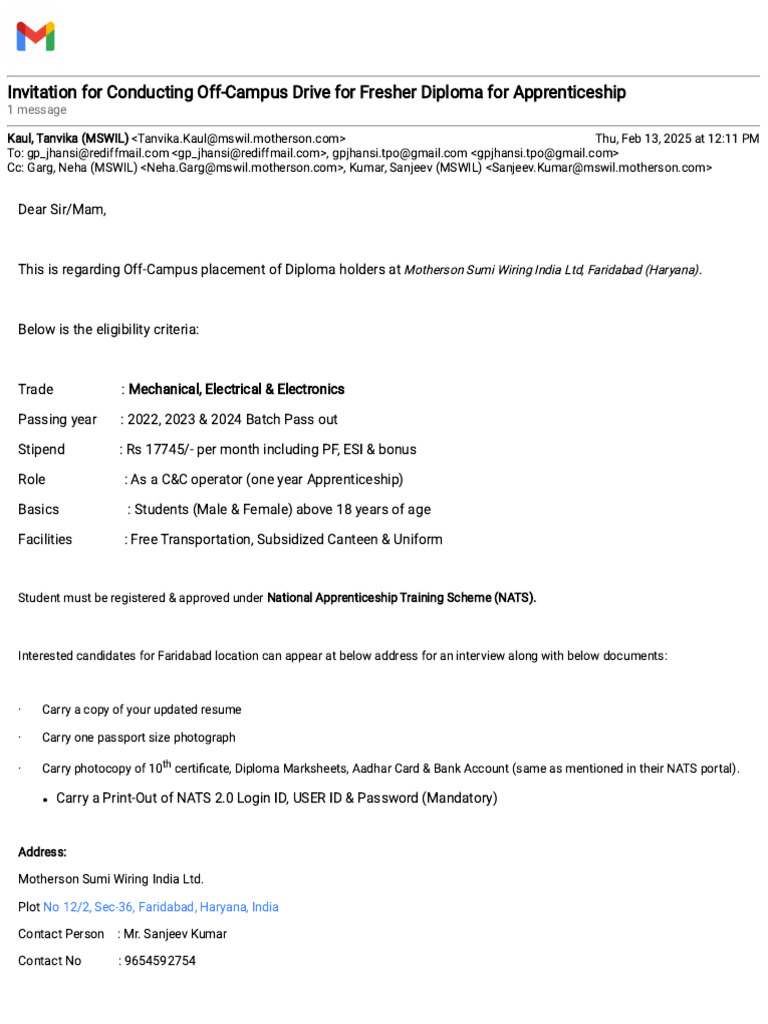 Invitation for Conducting Off-Campus Drive for Fresher Diploma for Apprenticeship
