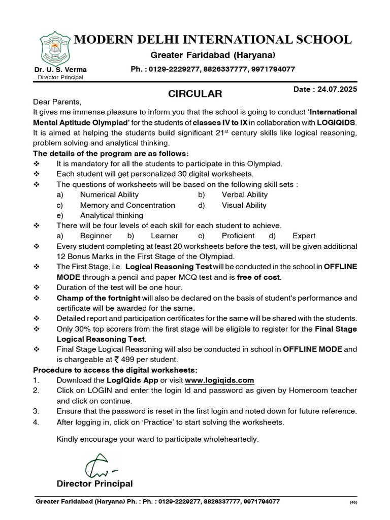 Mental Aptitude Olympiad’ for the students of classes IV to IX in collaboration with LOGIQIDS.