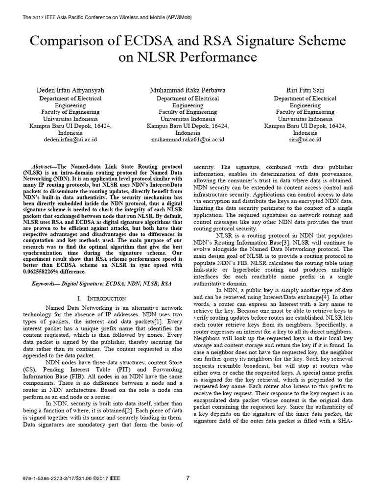 Keywords— Digital Signature; ECDSA; NDN; NLSR; RSA authoritative domain.