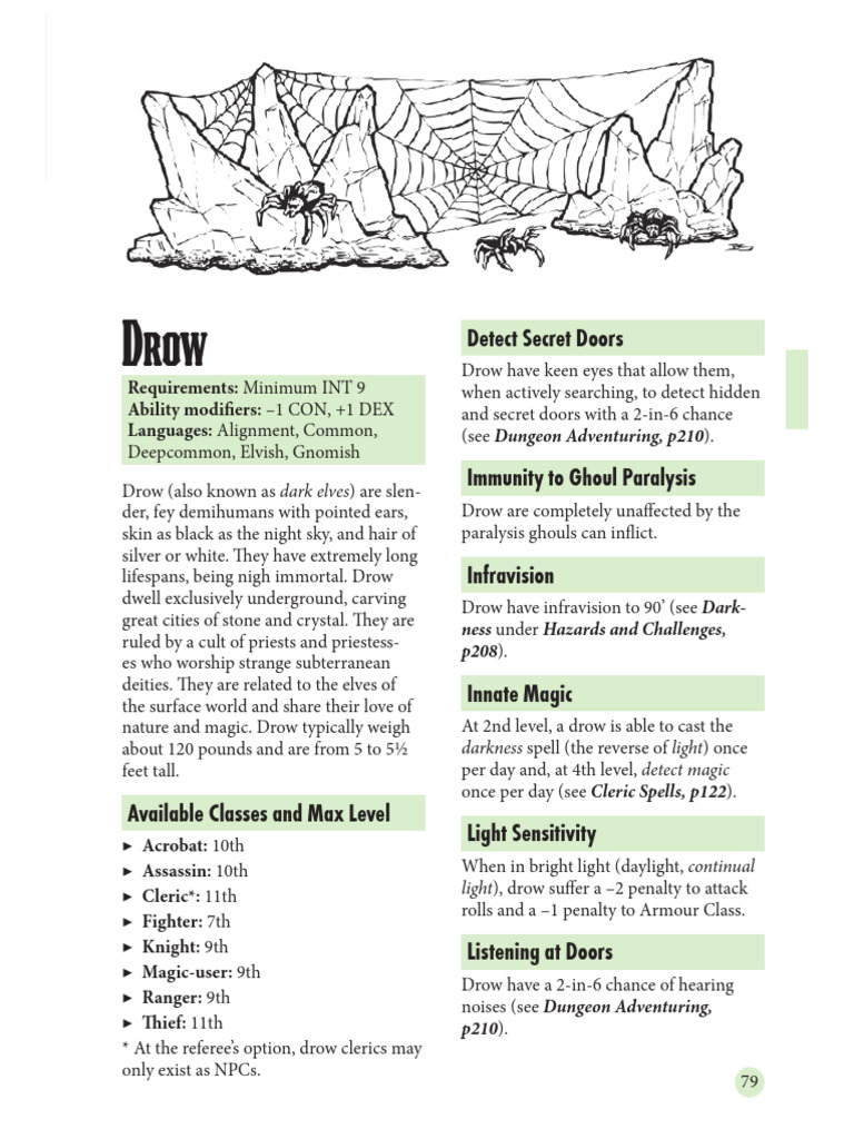 Ability modifiers: –1 CON, +1 DEX and secret doors with a 2-in-6 chance