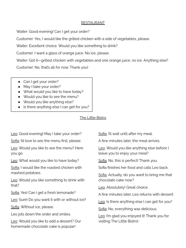 Leo: Good evening! May I take your order? Sofia: I’ll wait until after my meal.