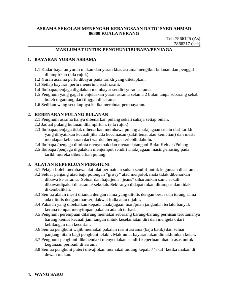6.1 Semua penghuni asrama adalah tertakluk kepada peraturan asrama dan sekolah secara