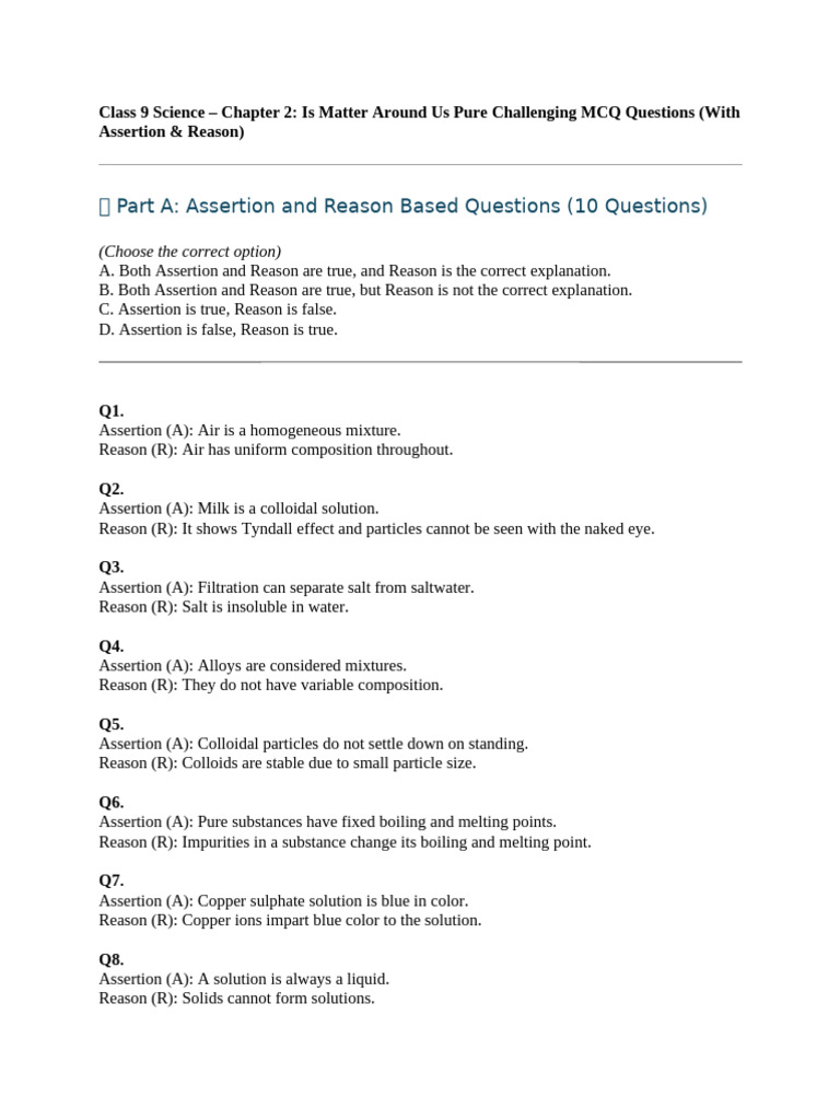 🔬 Part A: Assertion and Reason Based Questions (10 Questions)