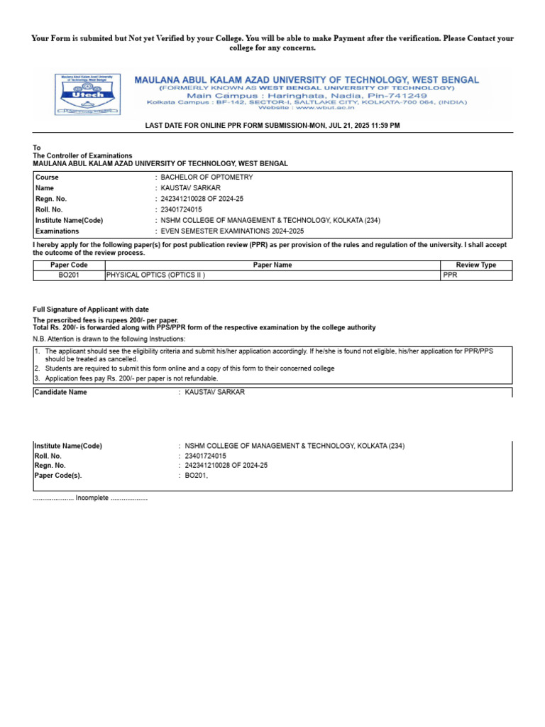 Your Form is submited but Not yet Verified by your College.