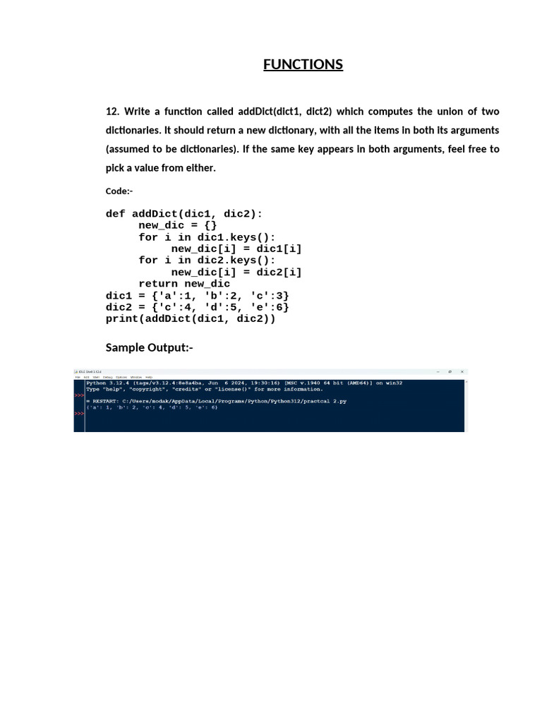 12. Write a function called addDict(dict1, dict2) which computes the union of two