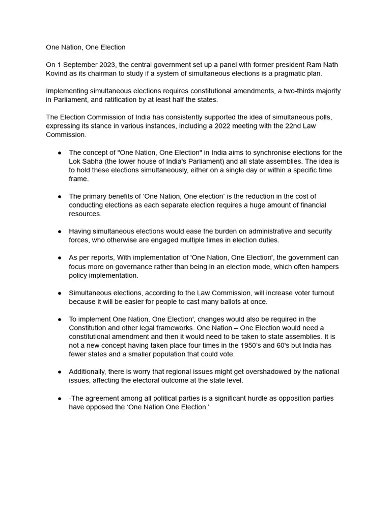 ● The concept of "One Nation, One Election" in India aims to synchronise elections for the