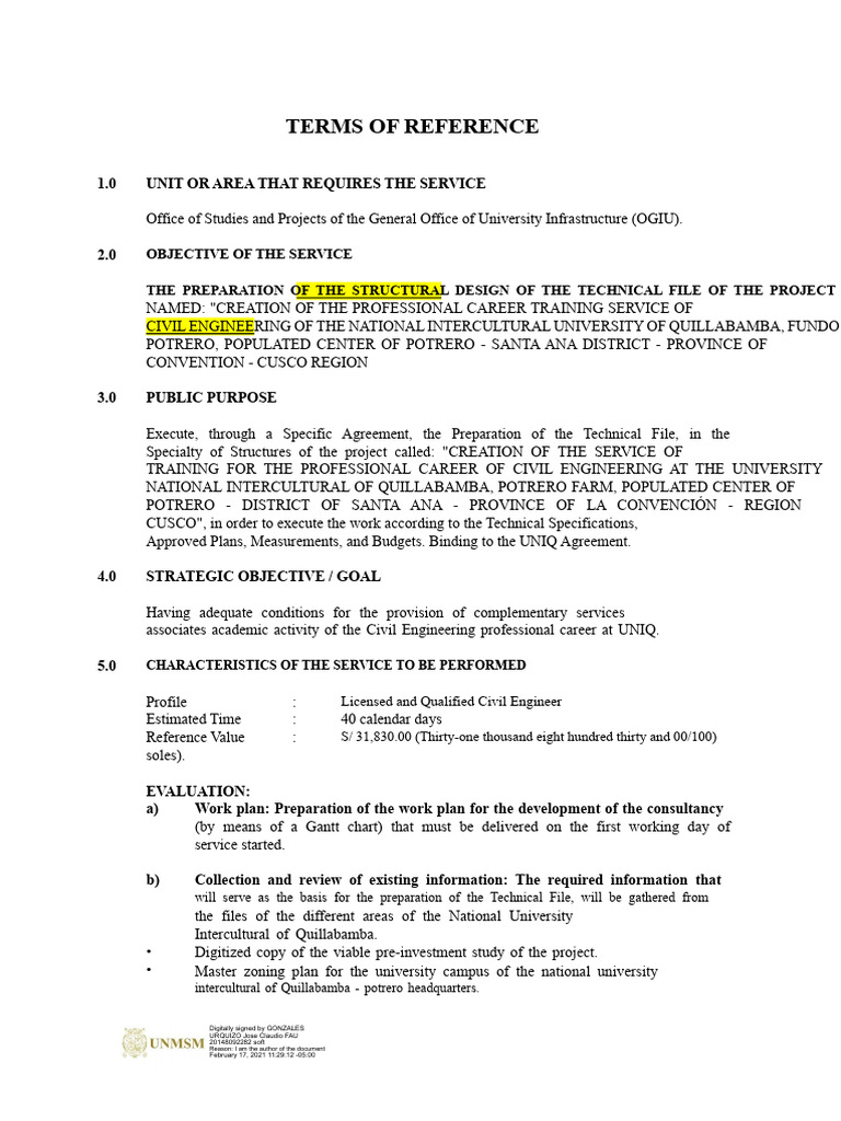 CUSCO", in order to execute the work according to the Technical Specifications,