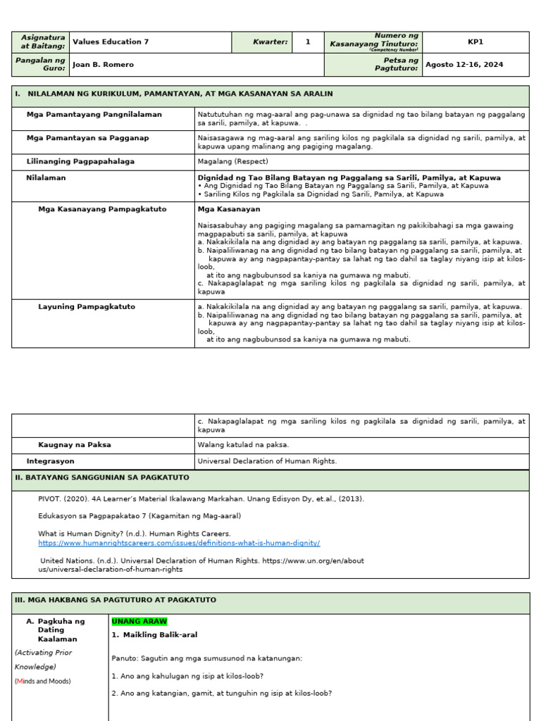 Values Education 7 Kwarter: 1 Kasanayang Tinuturo: KP1