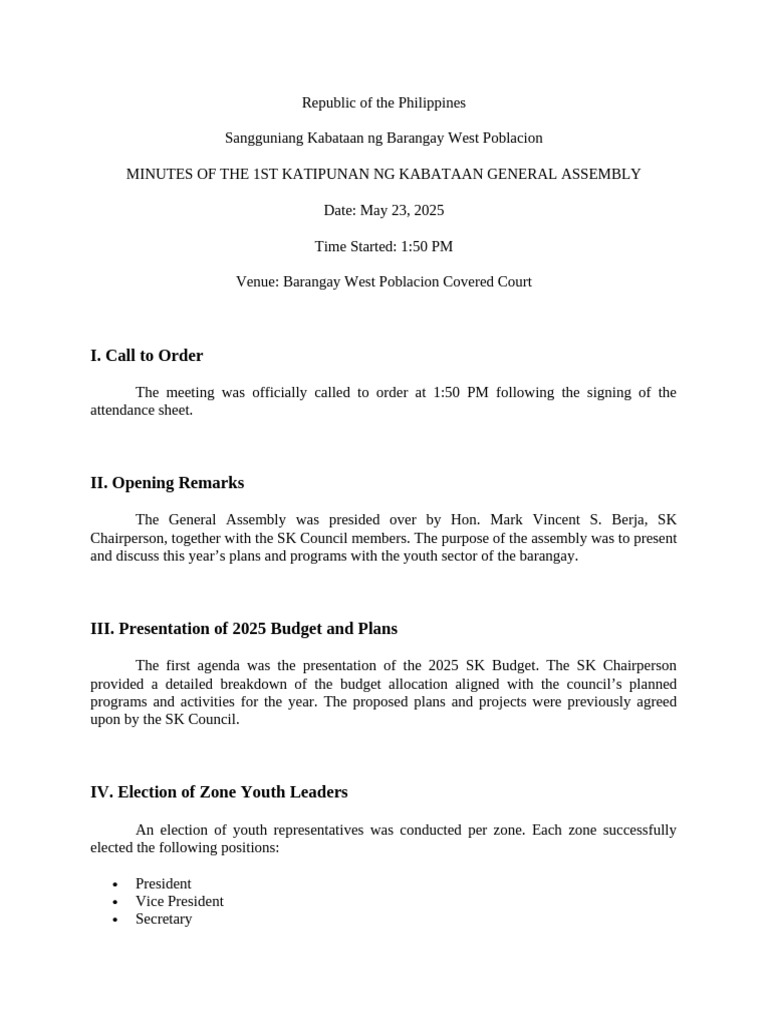 MINUTES OF THE 1ST KATIPUNAN NG KABATAAN GENERAL ASSEMBLY