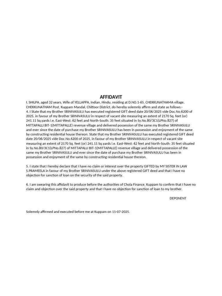 6. I am swearing this affidavit to produce before the authorities of Chola Finance, Kuppam to confirm that I have no