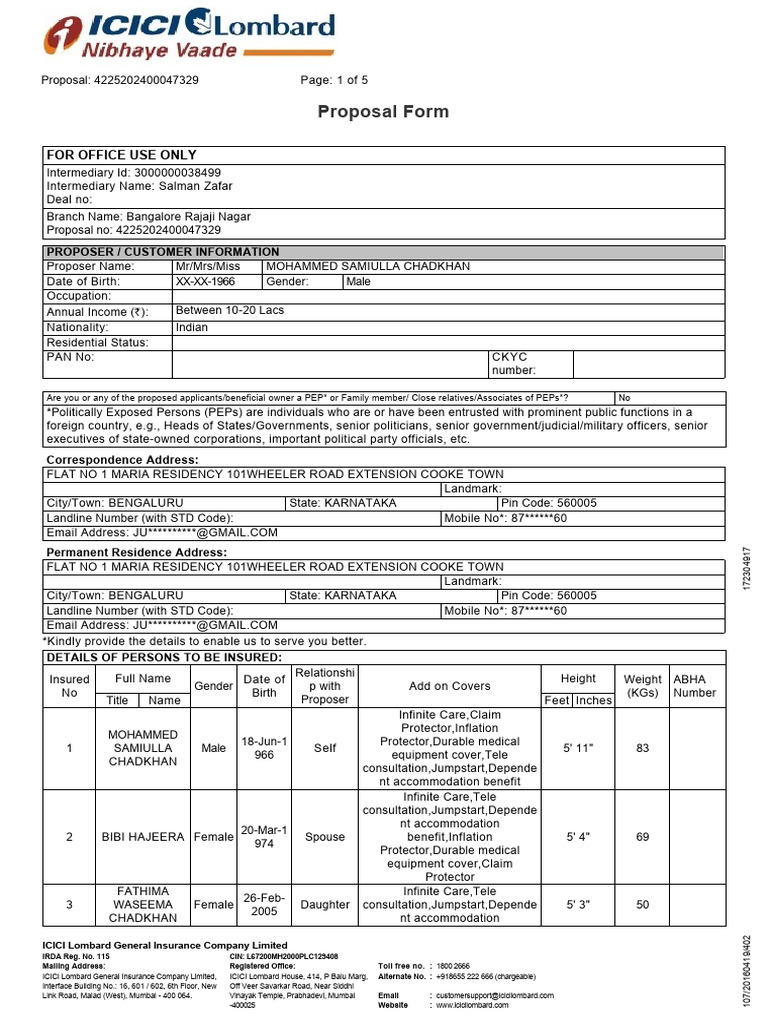 Proposer Name: Mr/Mrs/Miss MOHAMMED SAMIULLA CHADKHAN