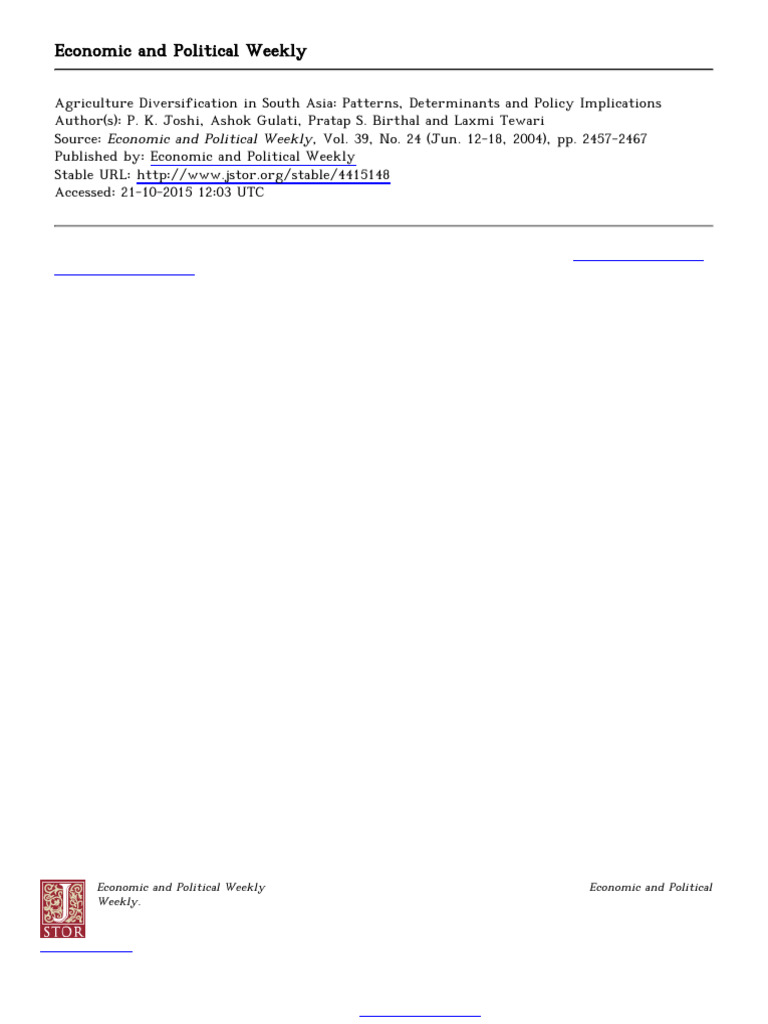 ResearchInstitutefor the Semi-AridTropics,New Delhi andPatancheru. Pandey, V K and K C Sharma (1996): 'Crop Diversification and Self-
