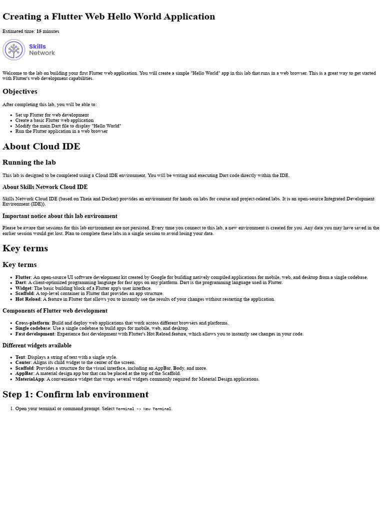 Welcome to the lab on building your first Flutter web application. You will create a simple "Hello World" app in this lab that runs in a web browser. This is a great way to get started