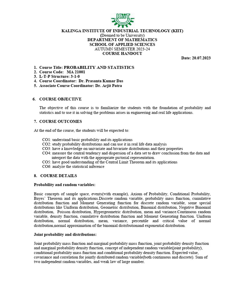 1. Course Title: PROBABILITY AND STATISTICS
