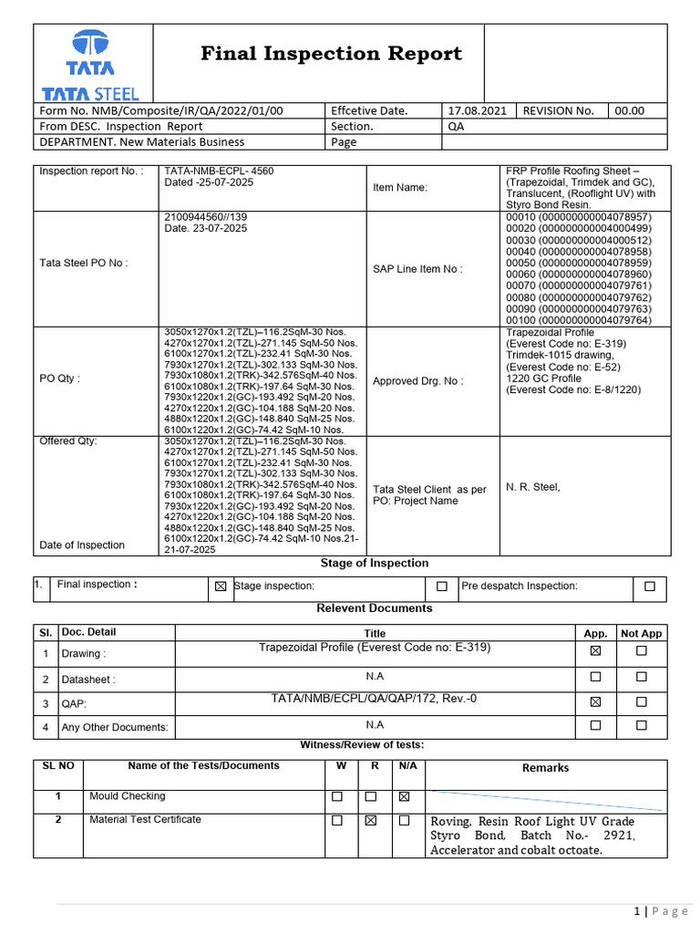 Inspection report No. : TATA-NMB-ECPL- 4560 FRP Profile Roofing Sheet –