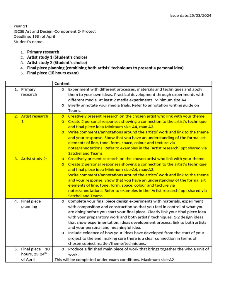 5. Final piece – 10 o Produce a finished main piece of work that brings together the whole unit of
