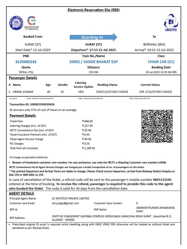 Invoice Number: PS25813568024311 Address: Indian Railways New Delhi