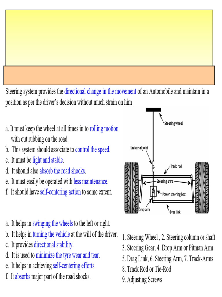 b. It helps in turning the vehicle at the will of the driver. 1. Steering Wheel , 2. Steering column or shaft