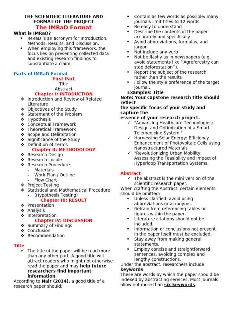 Parts of IMRaD Format Report the subject of the research