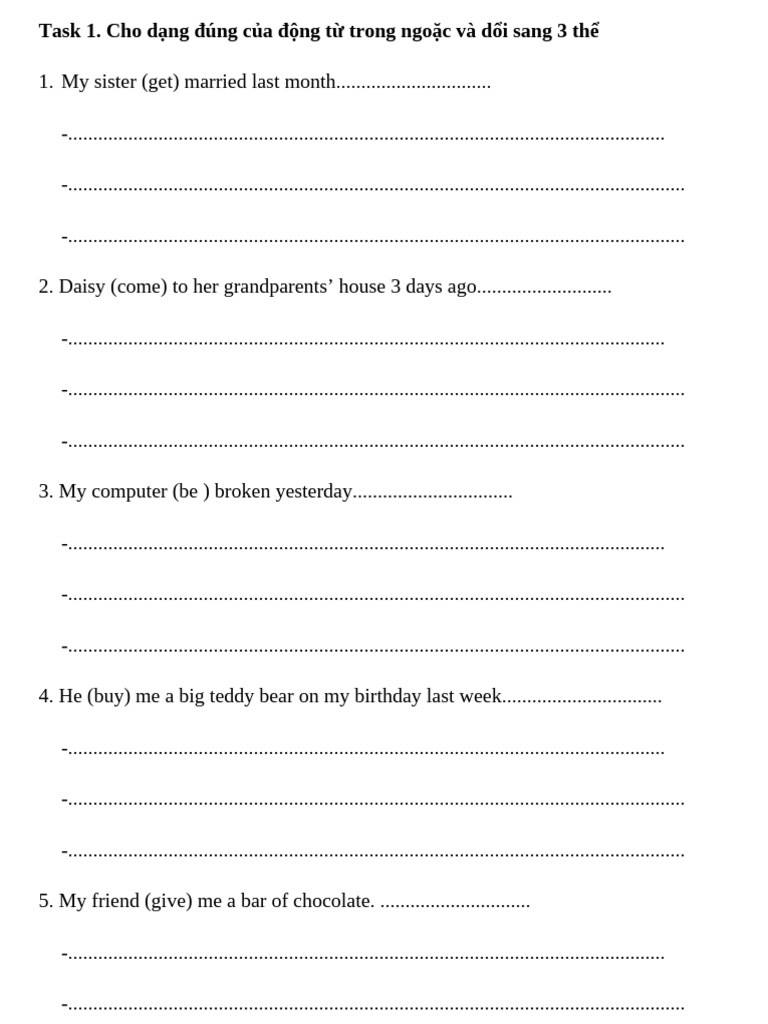 Cho dạng đúng của động từ trong ngoặc và dổi sang 3 thể