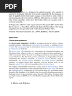with different velocities inside the crystal. This induced birefringence is the basis of the electro-optic effect. The two components travel in the same direction through the crystal and do not become physically separated. But the two components, in phase as they enter the crystal, emerge with different phases. As they traverse the crystal, they accumulate a phase difference, which depends on the distance traveled and on the applied voltage. When the beams emerge from the crystal, the polarization of the combined single beam depends on the accumulated phase difference. If the phase difference is one-half wavelength, the polarization is rotated by 90 from its original direction. This by itself does not change the intensity of the beam. But, with the analyzer, the transmission of the entire system varies, according to T = T0 sin2(p D nL/l ) Equation 1 where T is the transmission, T0 the intrinsic transmission of the assembly, taking into account all the losses, D n the birefringence (that is, the difference in refractive index for the two polarizations), L the length of the crystal, and l the wavelength of the light. The birefringence is an increasing function of the applied voltage, so that the transmission of the device will be an oscillatory function of applied voltage. The maximum transmission occurs when D n = l /2L Equation 2 This occurs at a voltage called the half-wave voltage, denoted V1/2. The halfwave voltage depends on the nature of the electro-optic material. The halfwave voltage for a particular material increases with the wavelength. Thus, in the infrared the required voltage is higher than in the visible. This factor can limit the application of electro-optic modulators in the infrared. The transmission of an electro-optic device as a function of applied voltage is shown in Figure 3, indicating the maximum transmission at the half-wave voltage.
