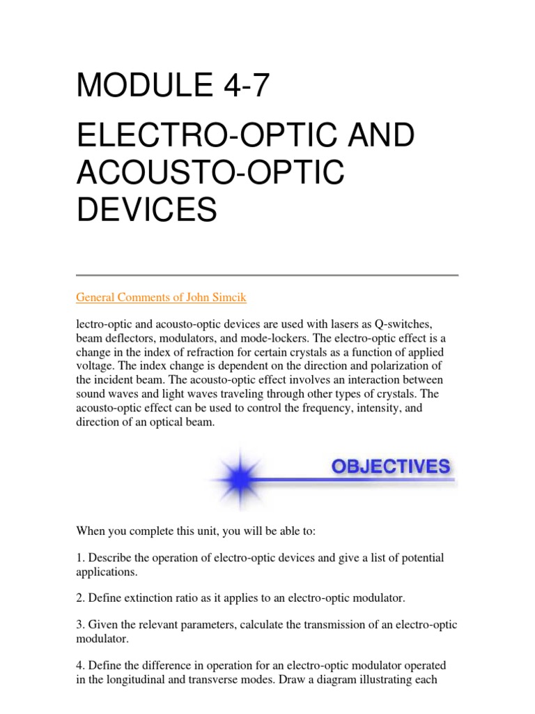 When you complete this unit, you will be able to: 1. Describe the operation of electro-optic devices and give a list of potential applications. 2. Define extinction ratio as it applies to an electro-optic modulator. 3. Given the relevant parameters, calculate the transmission of an electro-optic modulator. 4. Define the difference in operation for an electro-optic modulator operated in the longitudinal and transverse modes. Draw a diagram illustrating each