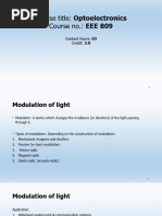 from zero. Observe the increase in the light reaching the power meter. As you increase the voltage in steps, record the voltage and the power meter reading at each step. The power meter reading should increase with increasing voltage at first. Then a maximum reading will be reached and, with further increase in voltage, the power meter reading should begin to decrease. When you have reached this point, you may terminate this part of the measurement. The value of the voltage at which the power is maximum is the half-wave voltage. Plot the power meter reading as a function of the applied voltage and determine the value of the half-wave voltage. Determine the extinction ratio for the modulator. The extinction ratio is the power meter reading when the applied voltage is equal to the half-wave voltage divided by the power meter reading when the voltage is zero. Use the plot of power versus applied voltage to derive the birefringence D n as a function of applied voltage. Use the equation: P(V) = P(V1/2) sin2 (p D n/l ) to determine D n as a function of voltage V. Here P(V) is the meter reading at voltage V, P(V1/2) is the meter reading at the half-wave voltage V1/2, L is the length of the crystal, and l is the wavelength (632.8 nm). You will need to determine the value of L. Either use the value specified by the manufacturer or carefully measure the length of the crystal. Solve the equation above for D n at several values of voltage V, using the values of P(V) obtained above. Then plot D n as a function of voltage V. Next, you will modulate the light at a high frequency. Remove the DC power supply and connect the sine-wave generator to the modulator. Replace the power meter with the photodiode and direct the beam onto the photodiode. Connect the output of the photodiode circuit to the oscilloscope input. Turn on the power supply and adjust the voltage so that the peak of the sine wave is equal to the half-wave voltage. This will lead to maximum contrast in the modulated beam. Observe the output of the detector on the oscilloscope. The scope trace should show a modulated output. Vary the frequency of the sine-wave generator and observe how the oscilloscope signal changes. With the frequency of the sine-wave generator set at a fixed value, measure the frequency of the modulation. Measure the time between successive maxima in the intensity of the modulated signal. Use the known sweep speed of the oscilloscope to make this measurement. Calculate the frequency of the modulation, which is equal to the reciprocal of the time just measured.