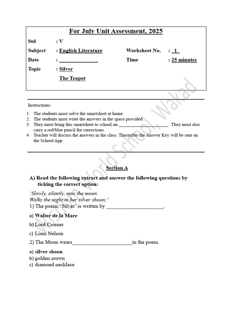 4. Teacher will discuss the answers in the class. Thereafter the Answer Key will be sent on