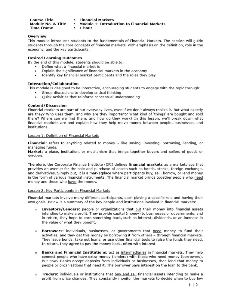 Lesson 1: Definition of Financial Markets