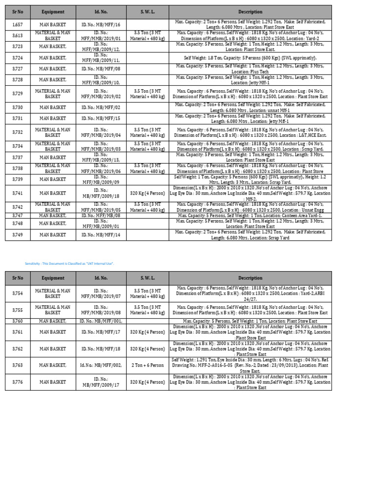 Sr No Equipment Id. No. S. W. L.