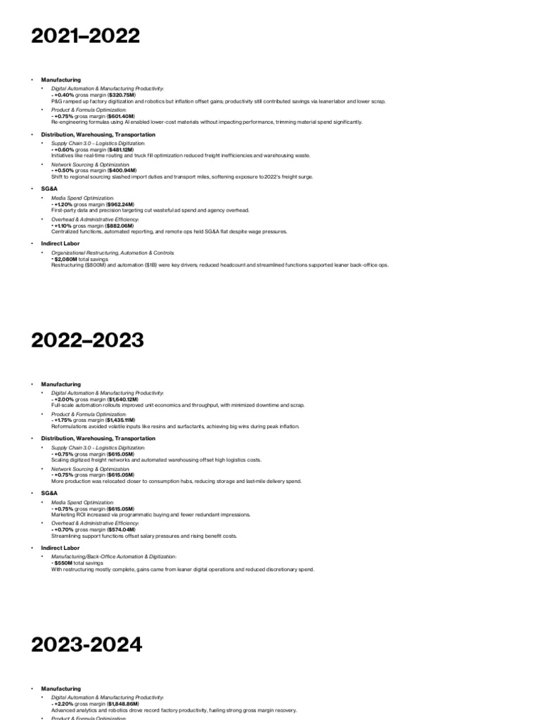 P&G ramped up factory digitization and robotics but inflation offset gains; productivity still contributed savings via leanerlabor and lower scrap.