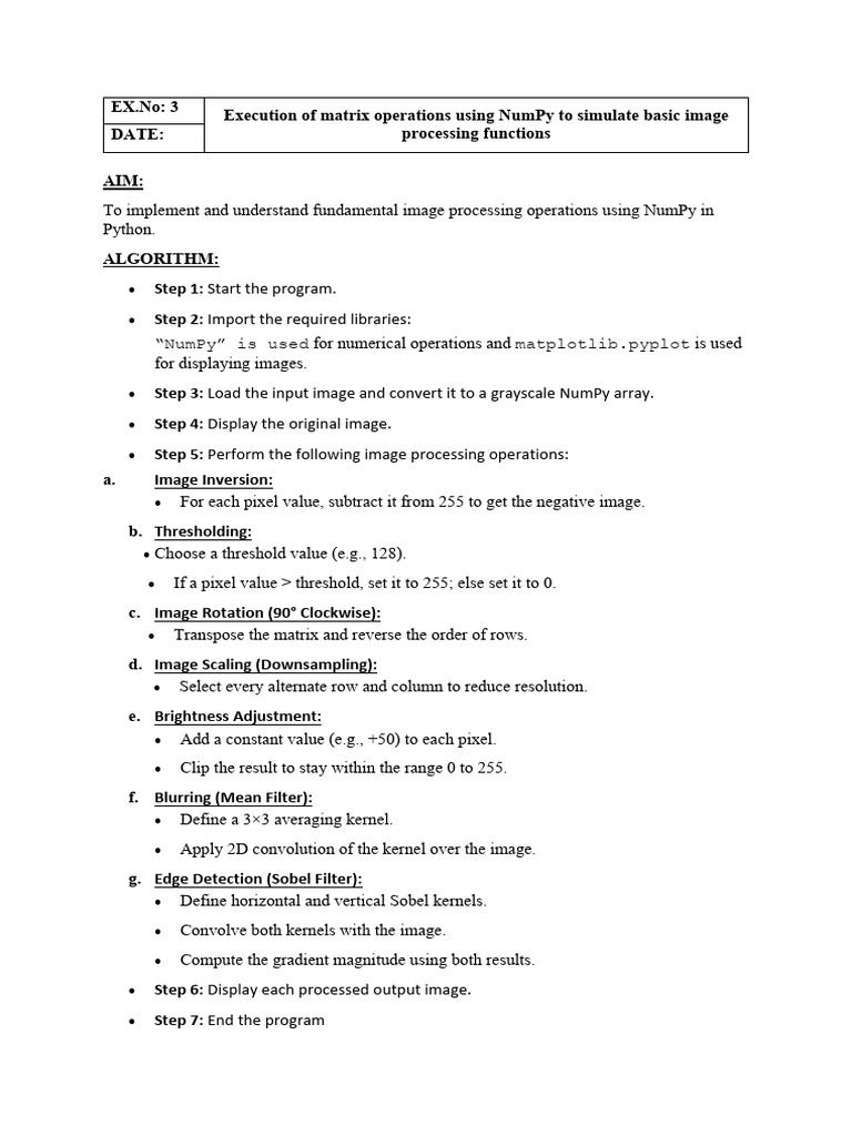 No: 3 Execution of matrix operations using NumPy to simulate basic image
