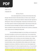 Michael Harvey 4 styles compared to negatives and consistent inserted myself into the research I was doing because I am a part of the group I was studying. I even classified my own accent (SouthernChicago Southern) in order to better understand where I was coming from in this research project. I learned that I had to understand where I stood on the issues if I ever intended to do anything worthwhile in my writing. In that last semester I really found that I always needed to invest a part of myself into the writing and the process itself. Through that I further developed the honesty I first talked about from freshmen year of high school without following some false medium. I was incorporating myself into words. In writing this paper I even find myself learning that I am more afraid of the perceptions people have of what I write than what Im actually saying in any assignment. Whether its grades or feedback Ive always been worried about being told what is wrong with my writing when in reality I should learn from it. Fear all too often holds me back from doing things in life and I let that fear take over my writing. Writing has always been something I was afraid of as I knew that in trying to be myself on paper that not only was my writing not what they were looking for, but that I wasnt what they were looking for. This might sound like a stretch but it is a feeling I have none the less. It is always present when I write because I dont make discoveries when I right, I already know what I believe and what I want to say. The hard part is finding a way to say it that makes sense for an audience that constantly looms in my mind. My writing is sometimes too personal because I am striving for my own voice to appear in the sentences. I still need to work to find that balance in my style and approach and learn what Im really trying to say when there arent the words to say it.