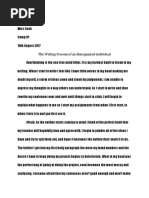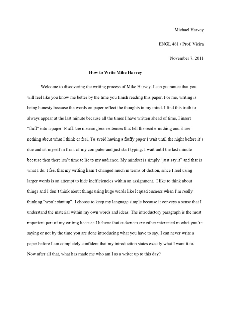 Vieira November 7, 2011 How to Write Mike Harvey Welcome to discovering the writing process of Mike Harvey. I can guarantee that you will feel like you know me better by the time you finish reading this paper. For me, writing is being honesty because the words on paper reflect the thoughts in my mind. I find this truth to always appear at the last minute because all the times I have written ahead of time, I insert fluff into a paper. Fluff: the meaningless sentences that tell the reader nothing and show nothing about what I think or feel. To avoid having a fluffy paper I wait until the night before its due and sit myself in front of my computer and just start typing. I wait until the last minute because then there isnt time to lie to my audience. My mindset is simply just say it and that is what I do. I feel that my writing hasnt changed much in terms of diction, since I feel using larger words is an attempt to hide inefficiencies within an assignment. I like to think about things and I dont think about things using huge words like loquaciousness when Im really thinking wont shut up. I choose to keep my language simple because it conveys a sense that I understand the material within my own words and ideas. The introductory paragraph is the most important part of my writing because I believe that audiences are either interested in what youre saying or not by the time you are done introducing what you have to say. I can never write a paper before I am completely confident that my introduction states exactly what I want it to. Now after all that, what has made me who am I as a writer up to this day?