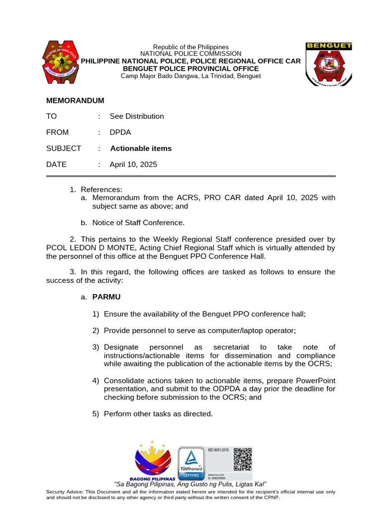 instructions/actionable items for dissemination and compliance