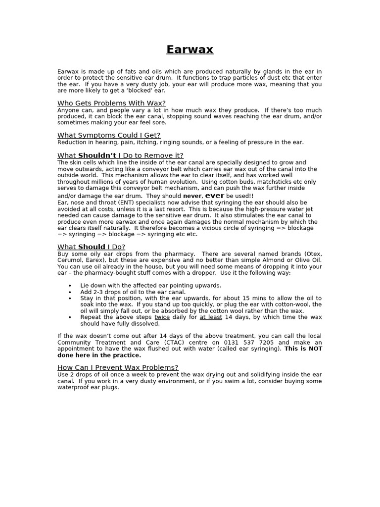 appointment to have the wax flushed out with water (called ear syringing). This is NOT
