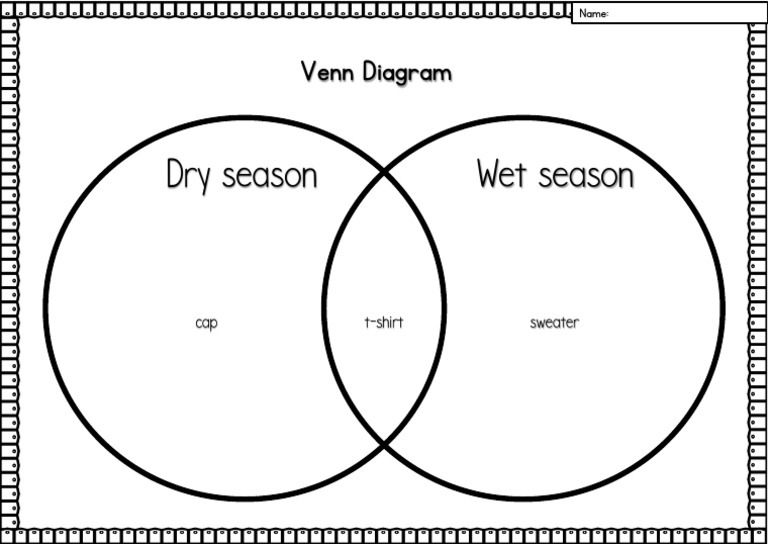 The document presents a Venn diagram comparing clothing suitable for dry and wet seasons. It lists 'cap' and 't-shirt' under dry season, while 'sweater' is categorized under wet season. The diagram visually represents the differences in clothing choices based on seasonal weather conditions.