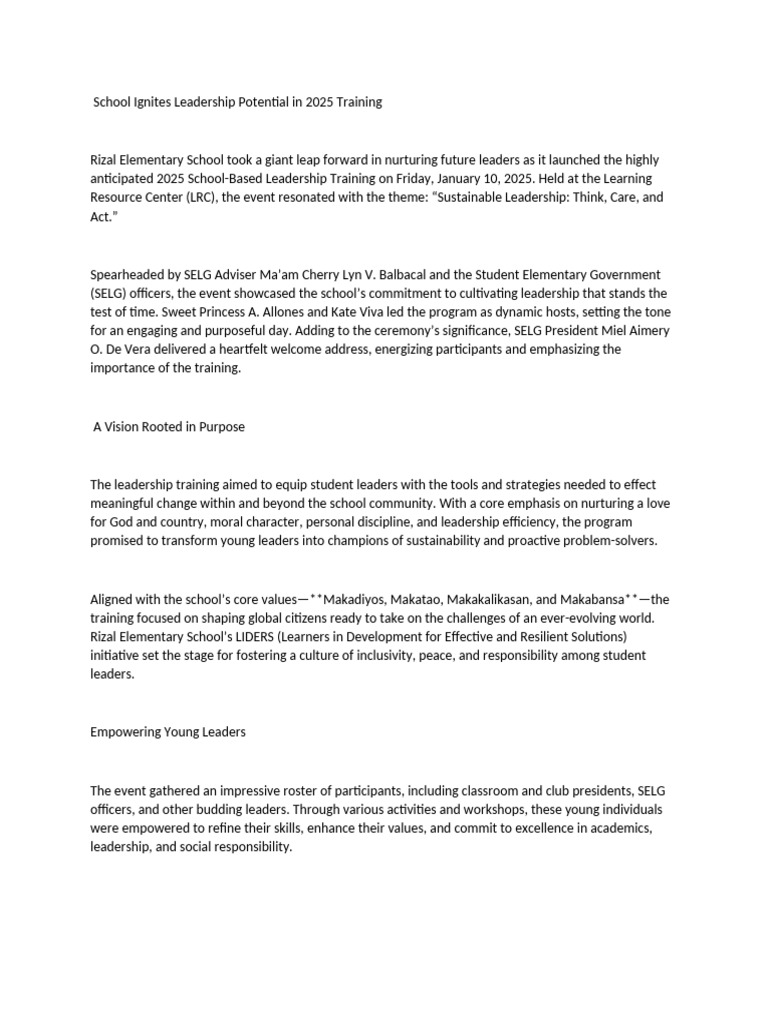 Rizal Elementary School’s LIDERS (Learners in Development for Effective and Resilient Solutions)